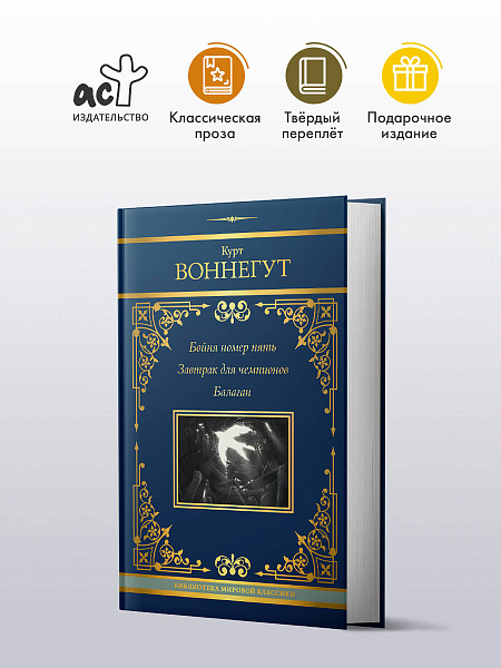 — Сразу три романа Курта Воннегута под одной обложкой. В предлагаемое издание вошли романы «Бойня номер пять», «Завтрак для чемпионов» и «Балаган».