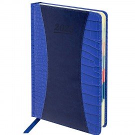 Внутренний блок включает 168 листов тонированной бумаги плотностью 70 г/м2. Каждая страничка имеет перфорированный угол. Благодаря стандартному формату А5 (148х218 мм) ежедневник удобно использовать как в офисе, так и на выездных деловых встречах. Твердая обложка состоит из двух материалов и стилизована под кожу крокодила с вставкой из материала под гладкую кожу. Материал обложки подходит для горячего тиснения.