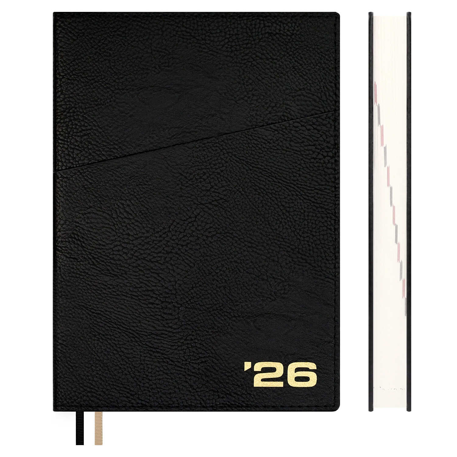 Ежедневник датированный 2026 ESCALADA, А5+, 176 л., арт. 70208/ 10 ШЕВРЕТ ЧЁРНЫЙ (кожзам: 175x245 мм, запаянный край, интегральный переплёт, материал обложки: искусственная кожа "Шеврет"; декор: тиснение фольгой; способ крепления блока: ниткошвейный; вн. блок: 176 л., кремовый офсет 80 г/м², печать в две краски (клетка), справочный материал: есть; перфорация углов блока: есть; закладка/-и: два ляссе; каптал: есть; форзац: печать пантоном; особенности: карман функциональный как часть обложки; персонализация возможна: да