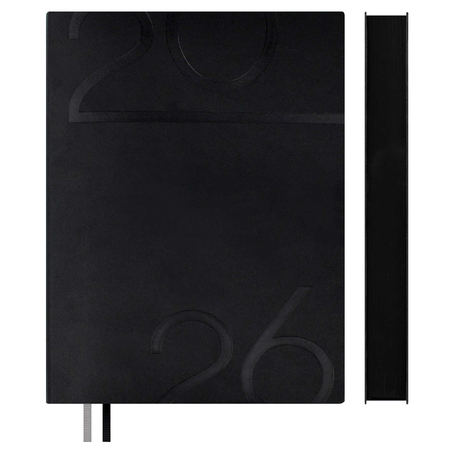 Ежедневник датированный 2026 ESCALADA, #ДУМАЙ КАК МИЛЛИАРДЕР, А5+, 176 л., арт. 70211/ 10 КАССАНДРА ЧЁРНЫЙ (кожзам: 175х245 мм, мягкий переплёт, запаянный край, материал обложки: искусственная кожа "Кассандра"; декор: блинтовое тиснение; способ крепления блока: ниткошвейный; вн. блок: 176 л., кремовый офсет 70 г/м², печать в две краски (линия), справочный материал: есть; перфорация углов блока: есть; отделка среза: окрашивание пантоном; закладка/-и: два ляссе; каптал: есть; форзац: печать пантоном; особенности: 1 лист с наклейками в комплекте, в блоке использованы мотивирующие высказывания из книги "Думай как миллиардер")