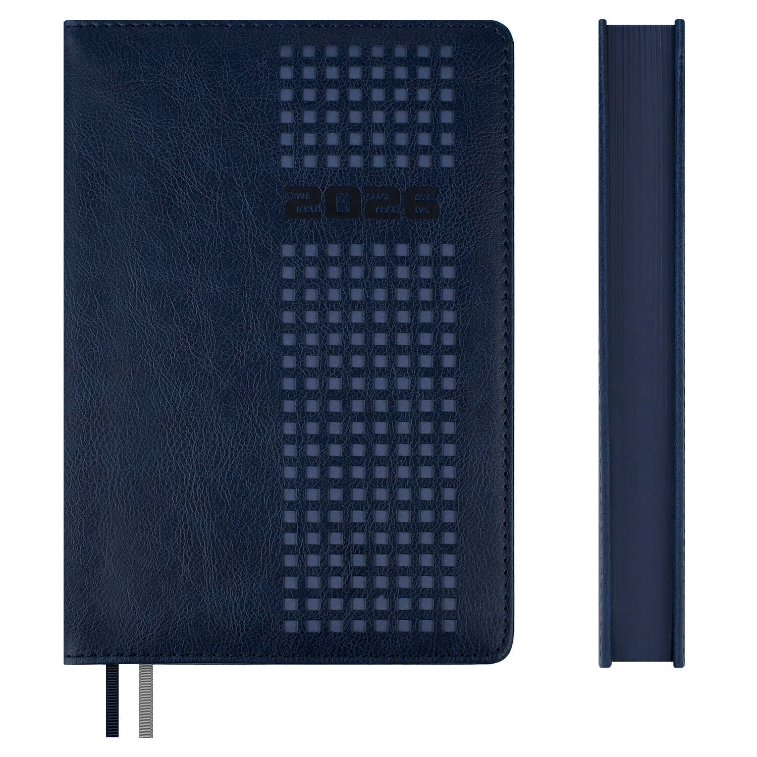 Ежедневник датированный 2026 ESCALADA, #ДУМАЙ КАК МИЛЛИАРДЕР, А5, 176 л., арт. 70216/ 15 ШЕВРО СИНИЙ (кожзам: 146х211 мм, твёрдый переплёт с поролоном, материал обложки: искусственная кожа "Шевро"; декор: блинтовое тиснение, перфорация + подложка из дизайнерской бумаги; способ крепления блока: ниткошвейный; вн. блок: 176 л., белый офсет 70 г/м², печать в две краски (линия), справочный материал: есть; перфорация углов блока: нет; отделка среза: окрашивание пантоном; закладка/-и: два ляссе)