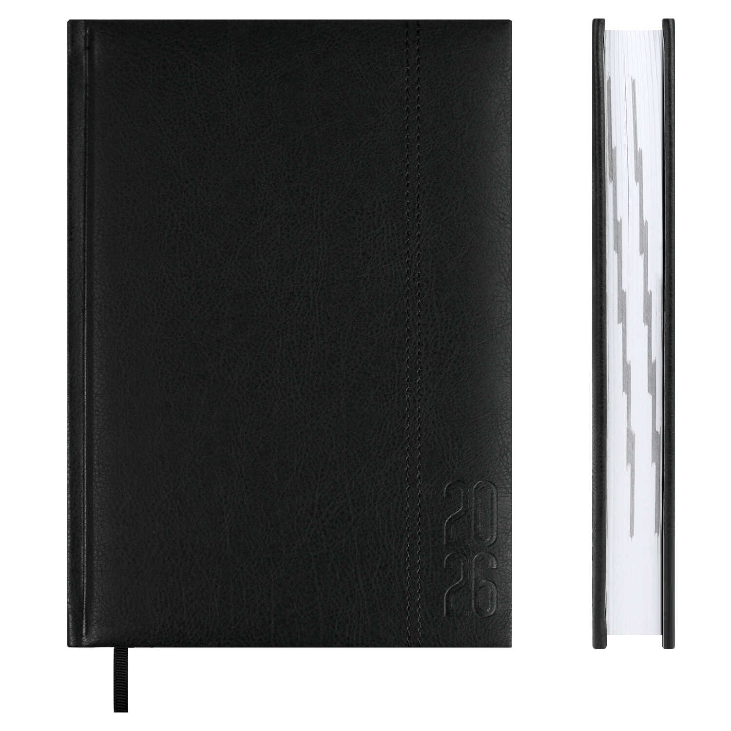 Ежедневник датированный 2026 ESCALADA, А5, 176 л., арт. 70224/ 15 НАППА ЧЁРНЫЙ (кожзам: 146х211 мм, твёрдый переплёт с поролоном, материал обложки: искусственная кожа "Наппа"; декор: блинтовое тиснение, отделочная строчка; способ крепления блока: ниткошвейный; вн. блок: 176 л., белый офсет 70 г/м², печать в одну краску (линия), справочный материал: есть; перфорация углов блока: нет; закладка/-и: одно ляссе; каптал: есть; форзац: без печати; персонализация возможна: да)