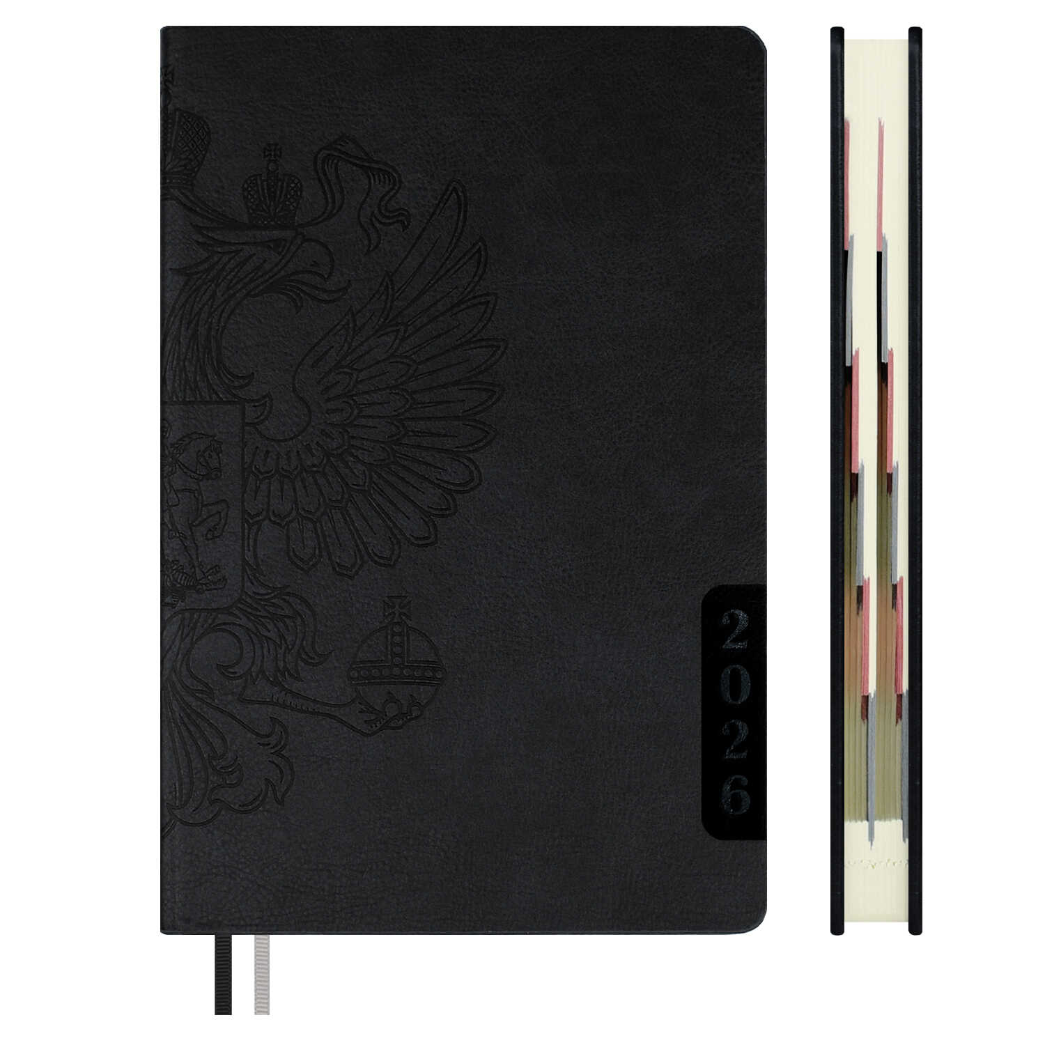 Ежедневник датированный 2026 ESCALADA, А5, 176 л., арт. 70245/ 15 НАППА ЧЕРНЫЙ (кожзам: 146x211 мм, твёрдый переплёт, запаянный край, материал обложки: искусственная кожа "Наппа"; декор: блинтовое тиснение; способ крепления блока: ниткошвейный; вн. блок: 176 л., кремовый офсет 70 г/м², печать в две краски (линия), справочный материал: есть; перфорация углов блока: есть; закладка/-и: два ляссе; каптал: есть; форзац: печать пантоном; особенности: вырубка блока по месяцам; персонализация возможна: да)