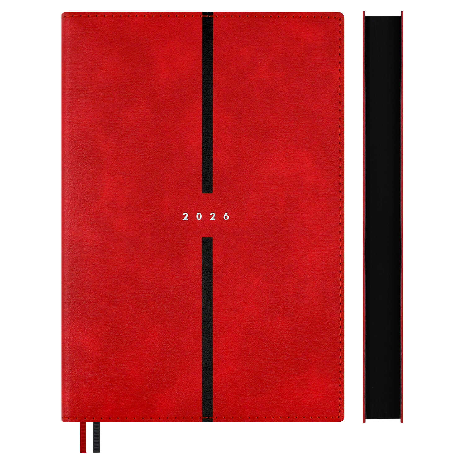 Ежедневник датированный 2026 ESCALADA, А5, 176 л., арт. 70262/ 15 ЛЕЗЕРЕТТО КРАСНЫЙ (кожзам: 146x211 мм, мягкий переплёт, материал обложки: искусственная кожа "Лезеретто"; декор: тиснение фольгой, печать шелкографией в одну краску; способ крепления блока: ниткошвейный; вн. блок: 176 л., кремовый офсет 70 г/м², печать в две краски (клетка), справочный материал: есть; перфорация углов блока: нет; отделка среза: окрашивание пантоном; закладка/-и: два ляссе; каптал: есть; форзац: печать пантоном; персонализация возможна: да