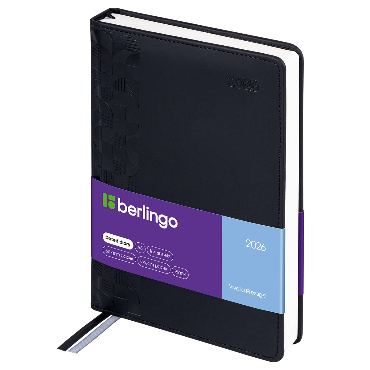 Датированный ежедневник на 2026 год Berlingo "Vivella Prestige" формата А5 идеален для повседневного использования. Модель представлена с твердой матовой обложкой. Имиджевое тиснение добавляет интересную деталь в классический дизайн обложки, которая сделана из чёрной экокожи.