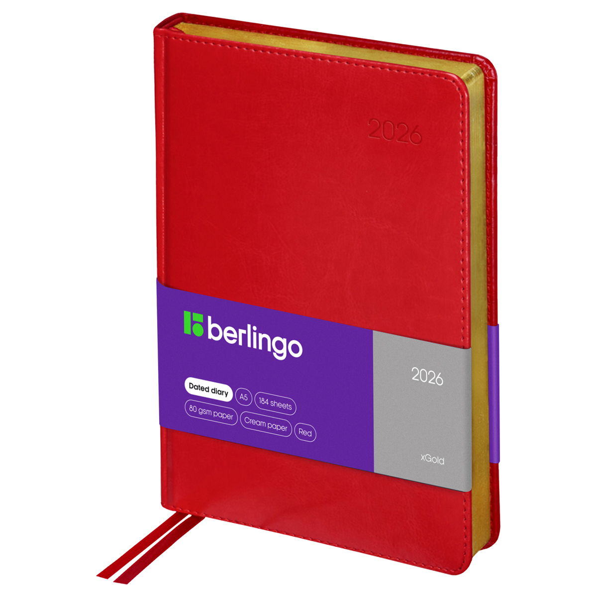 Датированный ежедневник на 2026 год Berlingo "xGold" формата А5 идеален для повседневного использования. Модель представлена с глянцевой обложкой из рельефной экокожи, которая имитирует кожу первоклассной выделки, и поролоновой прослойкой. Сочетание золотого фольгированного среза и красной обложки делает ежедневник элегантной деталью делового образа.