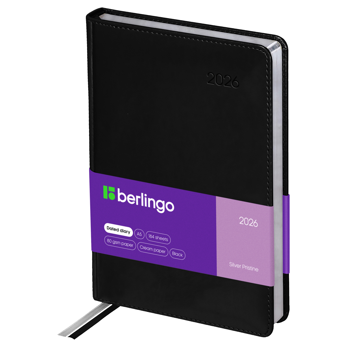 Датированный ежедневник на 2026 год Berlingo "Silver Pristine" формата А5 идеален для повседневного использования. Модель представлена с твердой обложкой из экокожи и поролоновой прослойкой. Сочетание серебряного фольгированного среза и чёрной обложки делает ежедневник элегантной деталью делового образа.