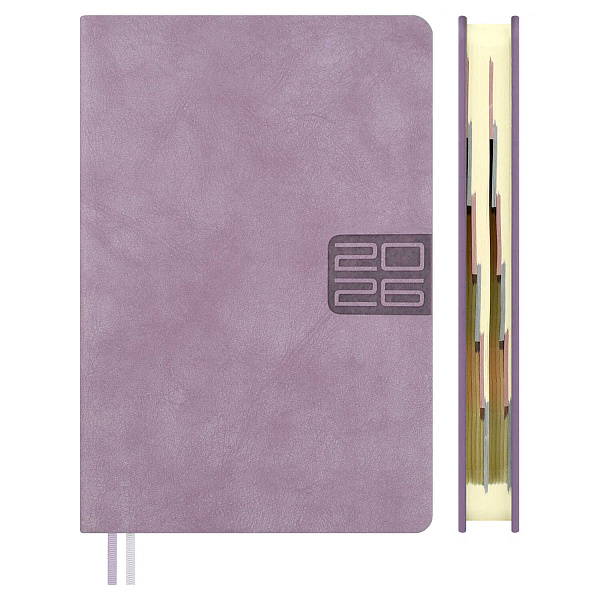 Ежедневник датированный 2026 ESCALADA, #ДУМАЙ КАК МИЛЛИАРДЕР, А6+, 176 л., арт. 70296/ 20 ТИВОЛ ГЛОСС СИРЕНЕВЫЙ (кожзам: 126x174 мм, твёрдый переплёт, запаянный край, материал обложки: искусственная кожа "Тиволи глосс"; декор: блинтовое тиснение; способ крепления блока: ниткошвейный; вн. блок: 176 л., тонированный офсет 70 г/м², печать в две краски (линия), справочный материал: есть; перфорация углов блока: есть; закладка/-и: два ляссе; каптал: есть; форзац: печать пантоном; особенности: вырубка блока по месяцам, в блоке использованы мотивирующие высказывания экстраординарной личности, предпринимателя и миллиардера, титулованного «Провидца века», шоумена и телеведущего, бывшего владельца конкурса красоты «Мисс Вселенная» и дважды президента США – Дональда Трампа)