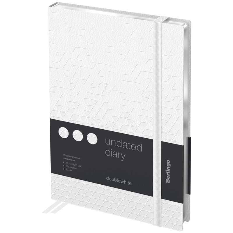 Недатированные ежедневники Berlingo ""DoubleWhite" в полужеской обложке из искусственной кожи белого цвета с имиджевым тиснением. Серебряный срез блока. Вертикальная фиксирующая резинка. Внутренний блок из 136 листов высококачественной кремовой бумаги повышенной плотности 80 г/м², пантонная печать в 2 краски, справочный материал и перфорированные уголки. Две закладки-ляссе. Отрывные заметки, бланки извещения о ДТП и справочные материалы. 3 комплекта стикеров станут приятным подарком. Внутренний карман на заднем форзаце для хранения записей и заметок. Индивидуальная упаковка.