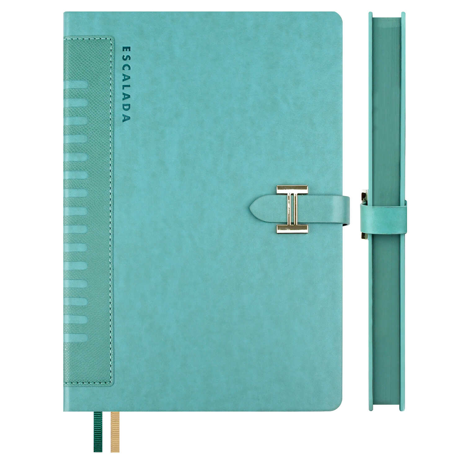 Ежедневник недатированный ESCALADA, А5+, 160 л., арт. 70580/ 10 ПРИСТИН МЯТНЫЙ (кожзам: 175x245 мм, твёрдый переплёт, материал обложки: искусственная кожа "Пристин", искусственная кожа "Снейк"; способ крепления блока: ниткошвейный; декор: блинтовое тиснение; вн. блок: 160 л., кремовый офсет 70 г/м², печать в одну краску (линия), справочный материал: есть; перфорация углов блока: нет; отделка среза: окрашивание пантоном; закладка/-и: два ляссе, каптал: есть; форзац: печать пантоном, особенности: застёжка "хляст в петле", комбинированные материалы