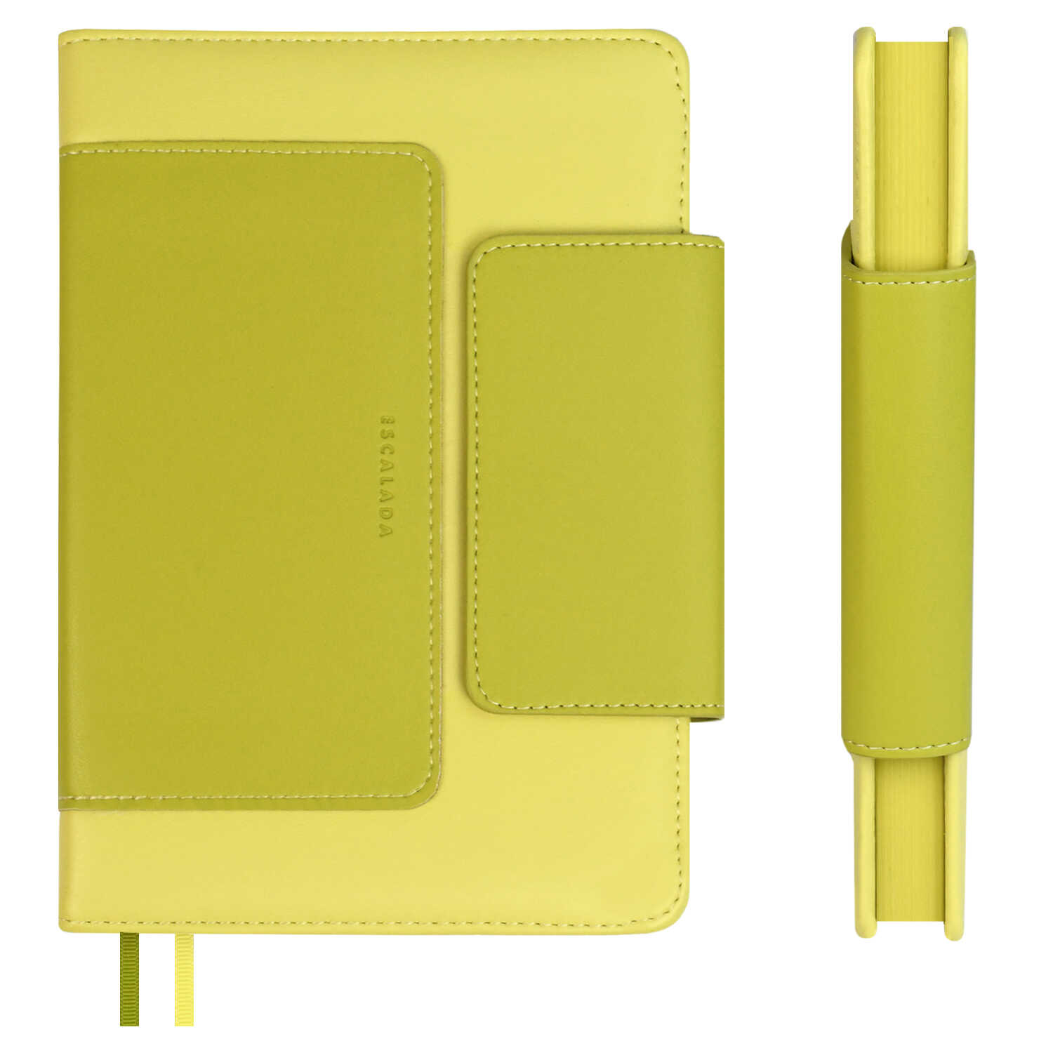 Ежедневник недатированный ESCALADA, А5, 160 л., арт. 70616/ 15 ЛАЙКА ЖЁЛТЫЙ (кожзам: 150/146х211 мм, твёрдый переплёт с поролоном, материал обложки: искусственная кожа "Лайка"; способ крепления блока: ниткошвейный; декор: аппликация из искусственной кожи, блинтовое тиснение; вн. блок: 160 л., кремовый офсет 70 г/м², печать в одну краску (линия), справочный материал: есть; перфорация углов блока: нет; отделка среза: окрашивание пантоном; закладка/-и: два ляссе, каптал: есть; форзац: печать пантоном, особенности: магнитный клапан фигурный)