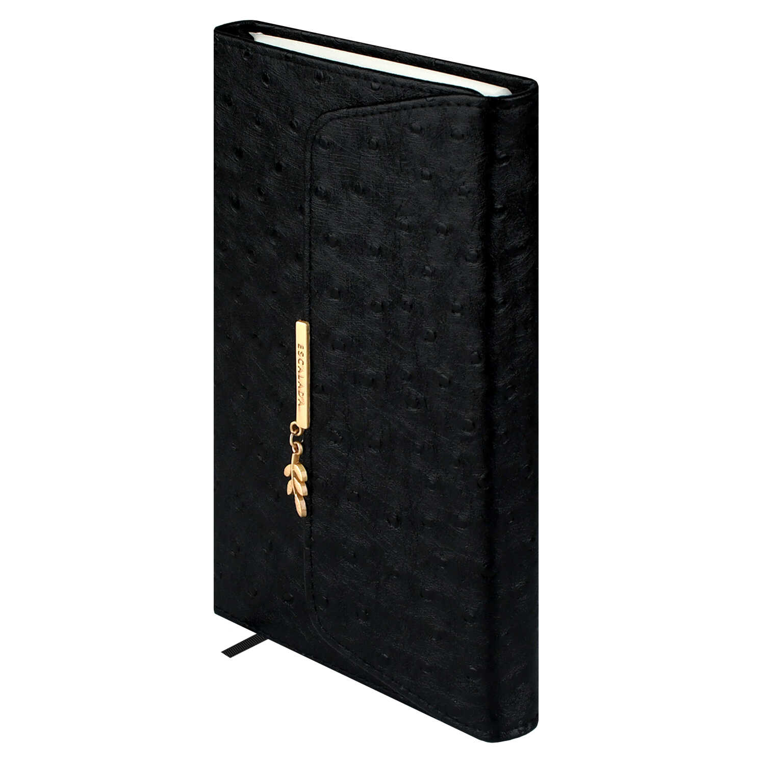 Ежедневник недатированный ESCALADA, А5, 160 л., арт. 70668/ 15 СТРАУС ЧЁРНЫЙ (кожзам: 126х211 мм, твёрдый переплёт, материал обложки: искусственная кожа "Страус"; способ крепления блока: ниткошвейный; декор: металлический шильд с декоративной металлической фигуркой; вн. блок: 160 л., кремовый офсет 70 г/м², печать в одну краску (линия), справочный материал: есть; перфорация углов блока: нет; отделка среза: окрашивание пантоном; закладка/-и: одно ляссе, каптал: есть; форзац: печать пантоном, тиснение фольгой, особенности: карман-уголок внутренний, магнитный клапан)