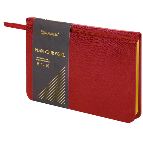 Внутренний блок включает 64 листа тонированной бумаги плотностью 70 г/м2. Благодаря малому формату А6 (95х155 мм) еженедельник удобно использовать как в офисе, так и на выездных деловых встречах. Твердая обложка, стилизованная под кожу рептилии, подходит для горячего тиснения. Дополнением является закладка-ляссе, с помощью которой при необходимости можно быстро открыть еженедельник на нужной странице. Помимо прочего, еженедельник снабжен обширным справочным материалом. Выполнен в ярком красном цвете.