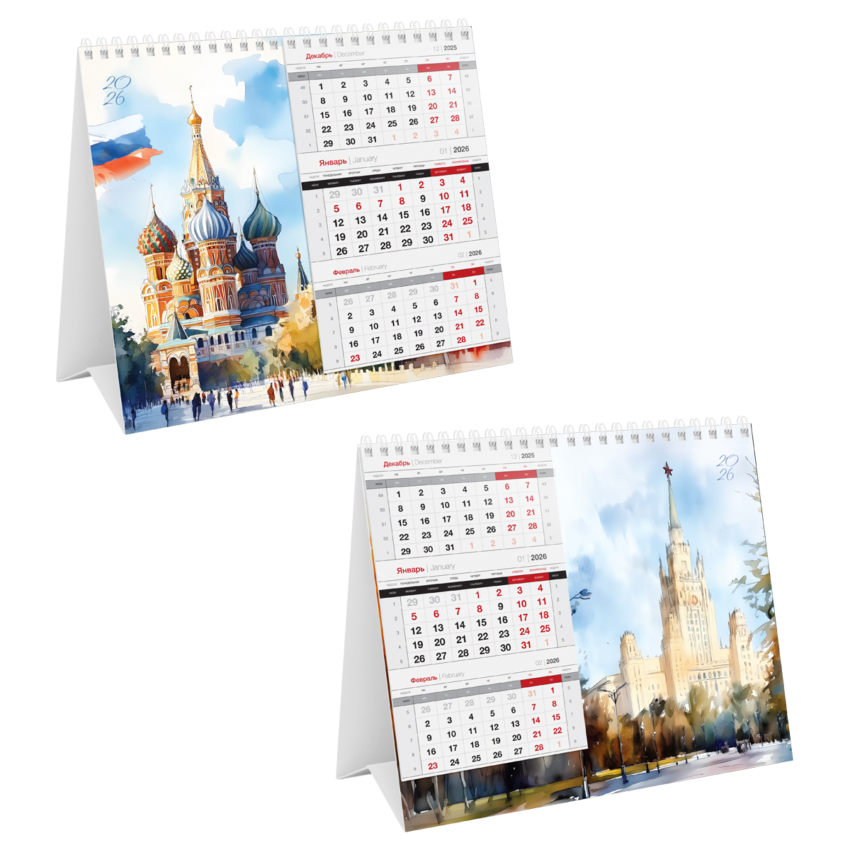 Настольный перекидной календарь-домик bg "Mono Premium. Москва" на 2026 год выполнен в удобном вертикальном формате 190*170 мм. Календарь состоит из 12 листов с календарной сеткой, где каждый разворот отображает три месяца. Основание украшено тематическим рисунком. Листы легко перелистываются благодаря гребневому креплению.