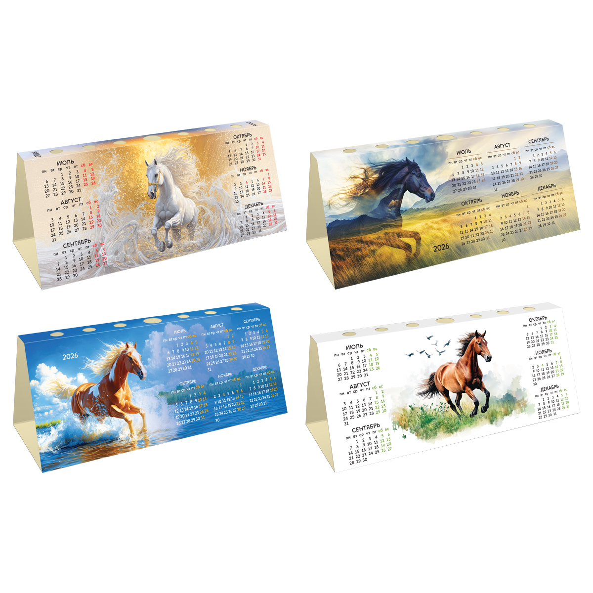 Календарь-домик настольный BG "Лошадь" на 2026 год – незаменимая вещь на рабочем столе и отличный помощник для офиса. Размер горизонтального календаря – 210*85 мм. Изготовлен из чистоцеллюлозного мелованного картона 300 г/м2 с полноцветной печатью.