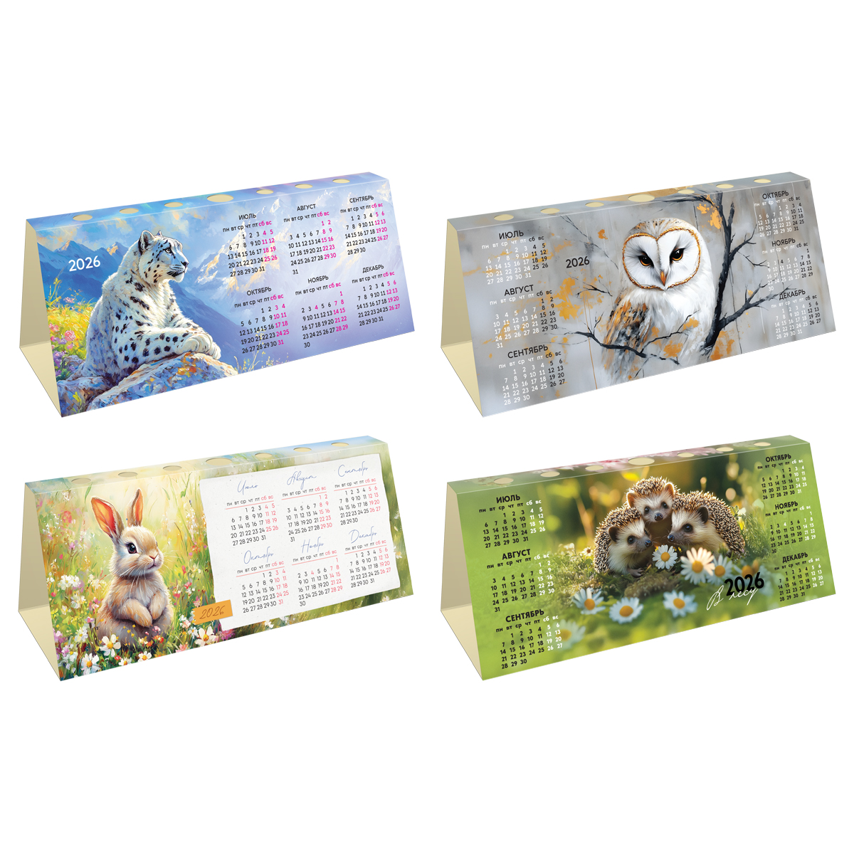 Календарь-домик настольный BG "Животные" на 2026 год – незаменимая вещь на рабочем столе и отличный помощник для офиса. Размер горизонтального календаря – 210*85 мм. Изготовлен из чистоцеллюлозного мелованного картона 300 г/м2 с полноцветной печатью.