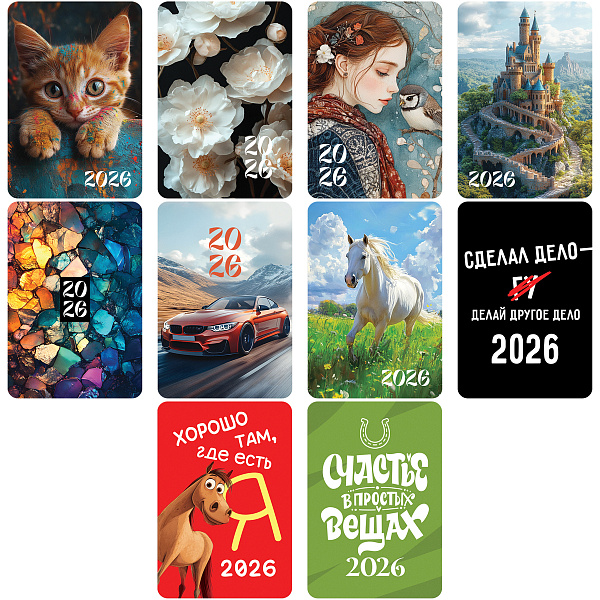 Карманный календарь на 2026 год BG «Микс» всегда будет под рукой. Его удобно носить в кошельке или кармане сумки благодаря миниатюрному размеру 65*95 мм. Плотность — 210 г/м2. Календарная сетка на год.