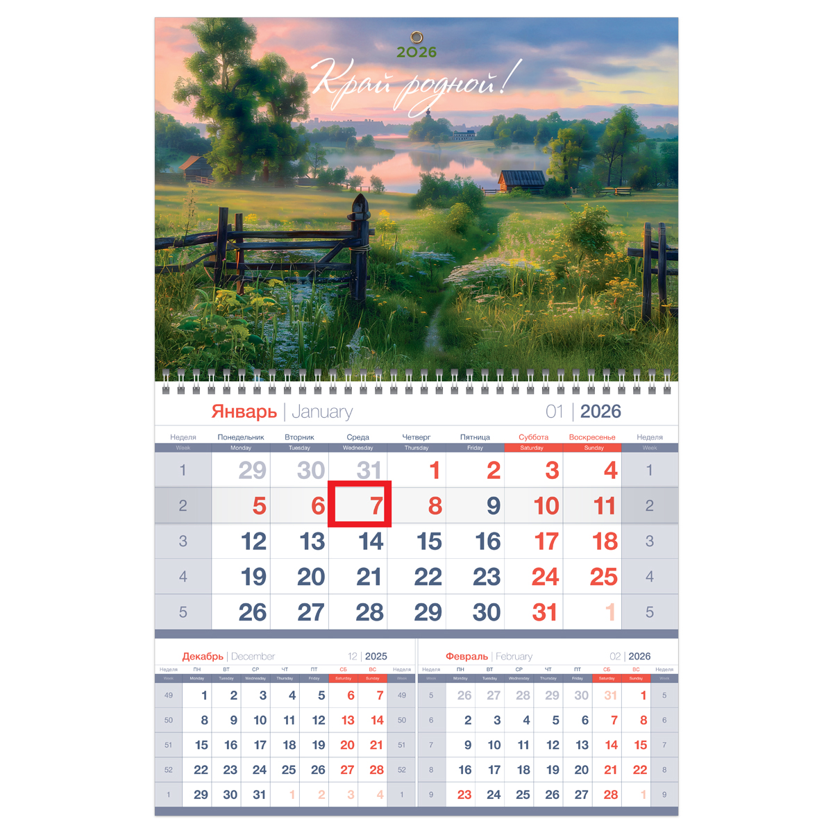 Квартальный календарь bg Mono premium «Край родной» на 2026 год — отличный инструмент для планирования в офисе и дома. Размер календаря — 295*475 мм. Календарный блок изготовлен из мелованной белой бумаги плотностью 80 г/м2 с печатью в две краски. Подложки изготовлены из чистоцеллюлозного мелованного картона 250 г/м2. Нижняя подложка имеет цветность в одну краску, верхняя — полноцветная. Дизайн календаря идеален для офиса. На одном листе отображены три месяца, что удобно для планирования. Есть бегунок-курсор и пикколо для подвески.