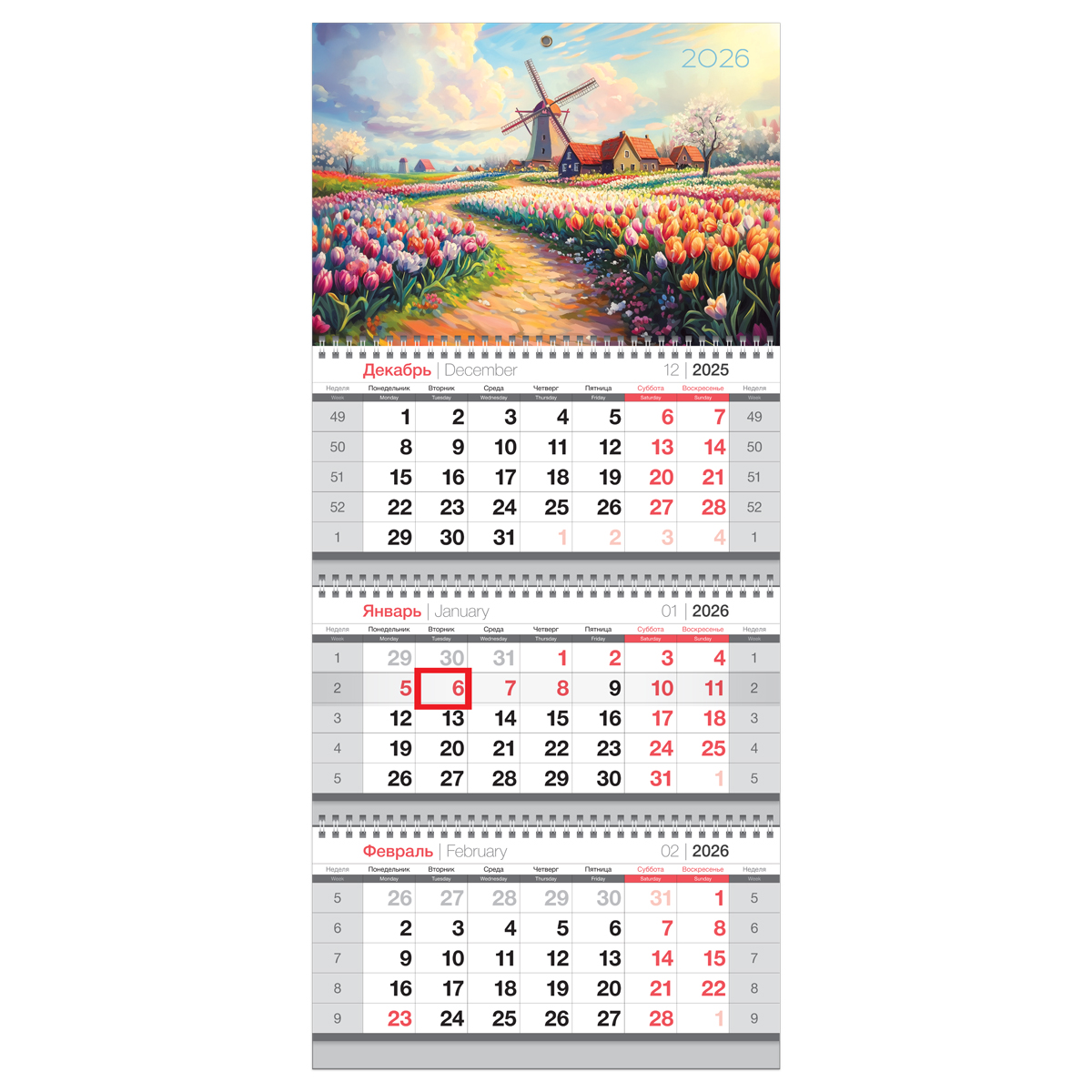 Квартальный календарь BG «Мельница» на 2026 год — помощник в планировании и украшение интерьера. Размер — 295*660 мм. Вертикальный календарь включает три блока, каждый из которых содержит 12 листов. Блоки держатся на трёх гребнях. Листы выполнены из офсетной белой бумаги плотностью 65 г/м² с использованием двухцветной печати. Подложка изготовлена из мелованного картона плотностью 320 г/м². Нижняя часть подложки напечатана в один цвет, а верхняя — полноцветная.