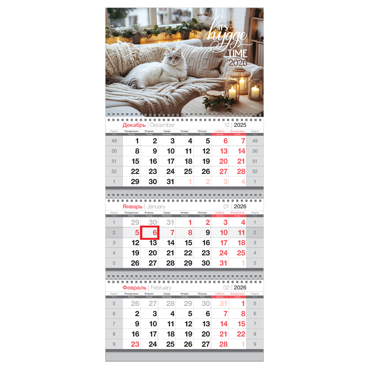 Квартальный календарь BG «Кот» на 2026 год — помощник в планировании и украшение интерьера. Размер — 295*660 мм. Вертикальный календарь включает три блока, каждый из которых содержит 12 листов. Блоки держатся на трёх гребнях. Листы выполнены из офсетной белой бумаги плотностью 65 г/м² с использованием двухцветной печати. Подложка изготовлена из мелованного картона плотностью 320 г/м². Нижняя часть подложки напечатана в один цвет, а верхняя — полноцветная.