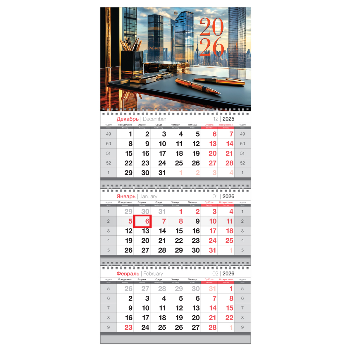 Квартальный календарь BG «Офис» на 2026 год — помощник в планировании и украшение интерьера. Размер — 295*660 мм. Вертикальный календарь включает три блока, каждый из которых содержит 12 листов. Блоки держатся на трёх гребнях. Листы выполнены из офсетной белой бумаги плотностью 65 г/м² с использованием двухцветной печати. Подложка изготовлена из мелованного картона плотностью 320 г/м². Нижняя часть подложки напечатана в один цвет, а верхняя — полноцветная.