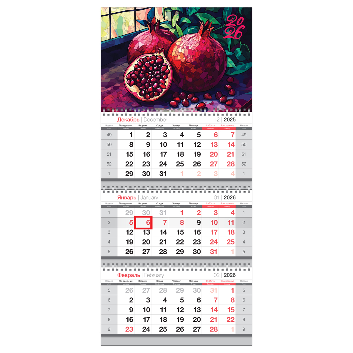 Квартальный календарь BG «Гранат» на 2026 год — помощник в планировании и украшение интерьера. Размер — 295*660 мм. Вертикальный календарь включает три блока, каждый из которых содержит 12 листов. Блоки держатся на трёх гребнях. Листы выполнены из офсетной белой бумаги плотностью 65 г/м² с использованием двухцветной печати. Подложка изготовлена из мелованного картона плотностью 320 г/м². Нижняя часть подложки напечатана в один цвет, а верхняя — полноцветная.