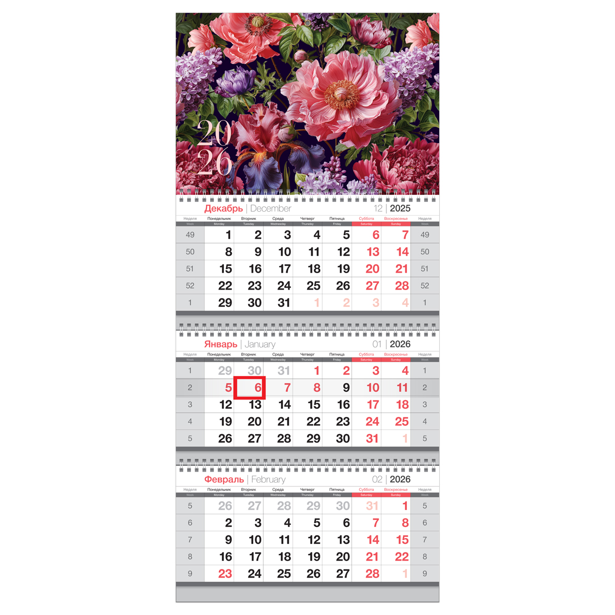 Календарь квартальный BG "Цветы" на 2026 год — отличный помощник в планировании. Размер вертикального календаря — 295*650 мм. Календарный блок изготовлен из офсетной белой бумаги плотностью 65 г/м2 с печатью в 2 краски. Верхняя и нижняя подложки изготовлены из чистоцеллюлозного мелованного картона 250 г/м2. Нижняя подложка имеет цветность в 1 краску, верхняя — полноцветная. Дизайн календаря идеален для офиса. Есть удобный бегунок-курсор и пикколо для подвески.