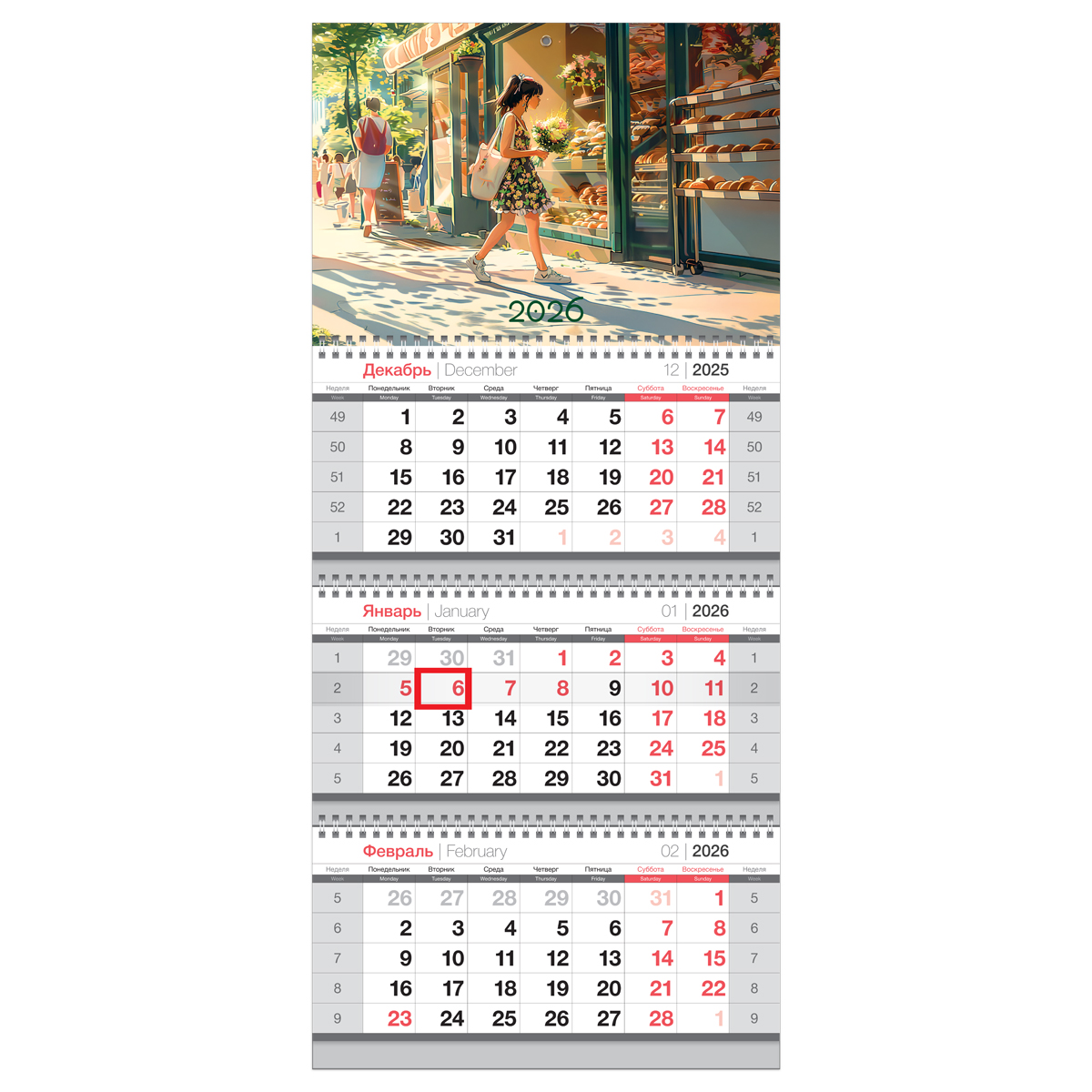 Квартальный календарь BG «Солнечная улица» на 2026 год — помощник в планировании и украшение интерьера. Размер — 295*660 мм. Вертикальный календарь включает три блока, каждый из которых содержит 12 листов. Блоки держатся на трёх гребнях. Листы выполнены из офсетной белой бумаги плотностью 65 г/м² с использованием двухцветной печати. Подложка изготовлена из мелованного картона плотностью 320 г/м². Нижняя часть подложки напечатана в один цвет, а верхняя — полноцветная.