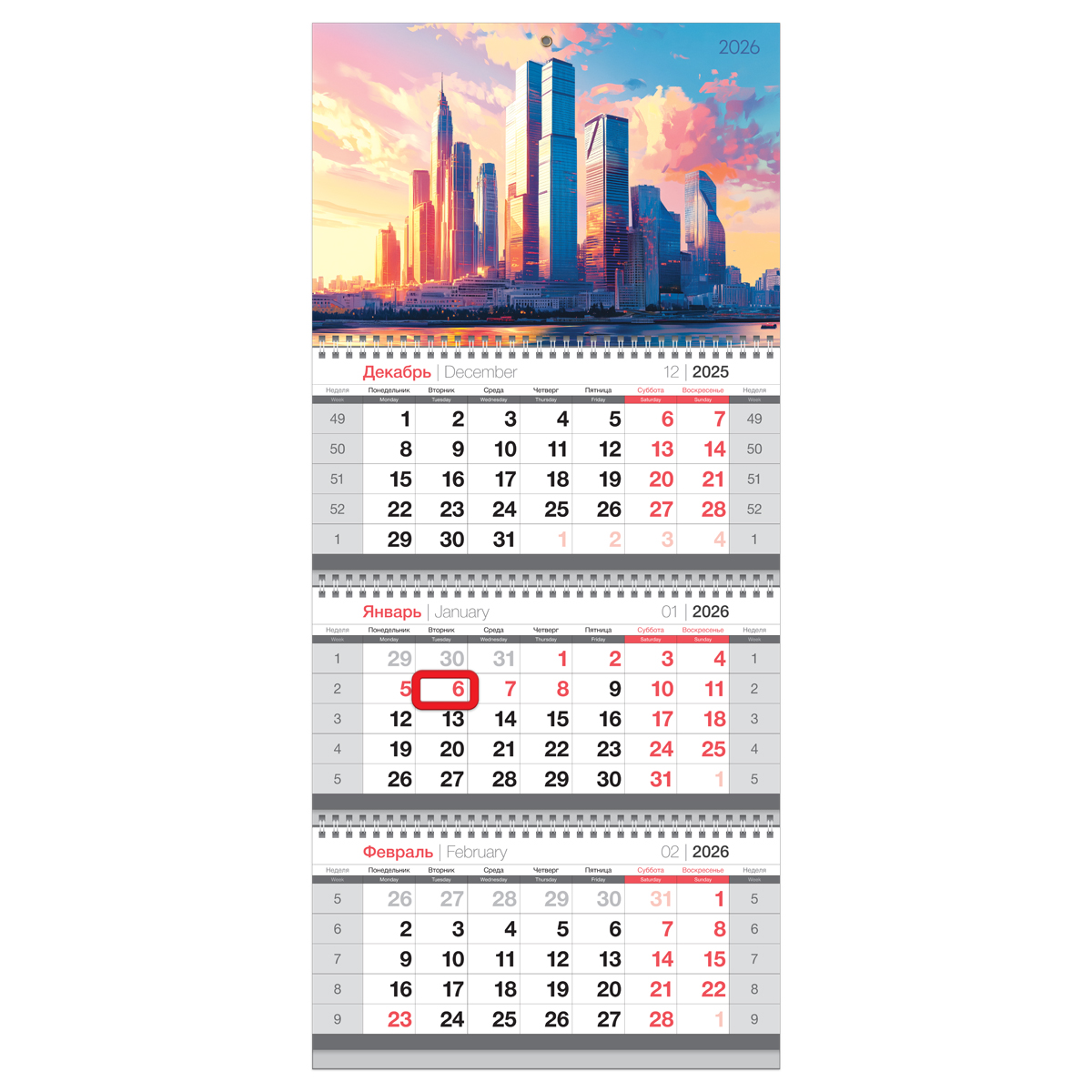 Календарь квартальный BG «Небоскрёбы» на 2026 год – незаменимая вещь в жизни делового человека и отличный помощник для офиса. Размер вертикального календаря – 295*650 мм. Календарный блок изготовлен из мелованной белой бумаги плотностью 80 г/м2 с печатью в 2 краски. Верхняя и нижняя подложки изготовлены из чистоцеллюлозного мелованного картона 250 г/м2. Нижняя подложка имеет цветность в 1 краску, верхняя – полноцветная. Дизайн календаря идеален для офиса. В комплекте с календарем идет магнитный бегунок.