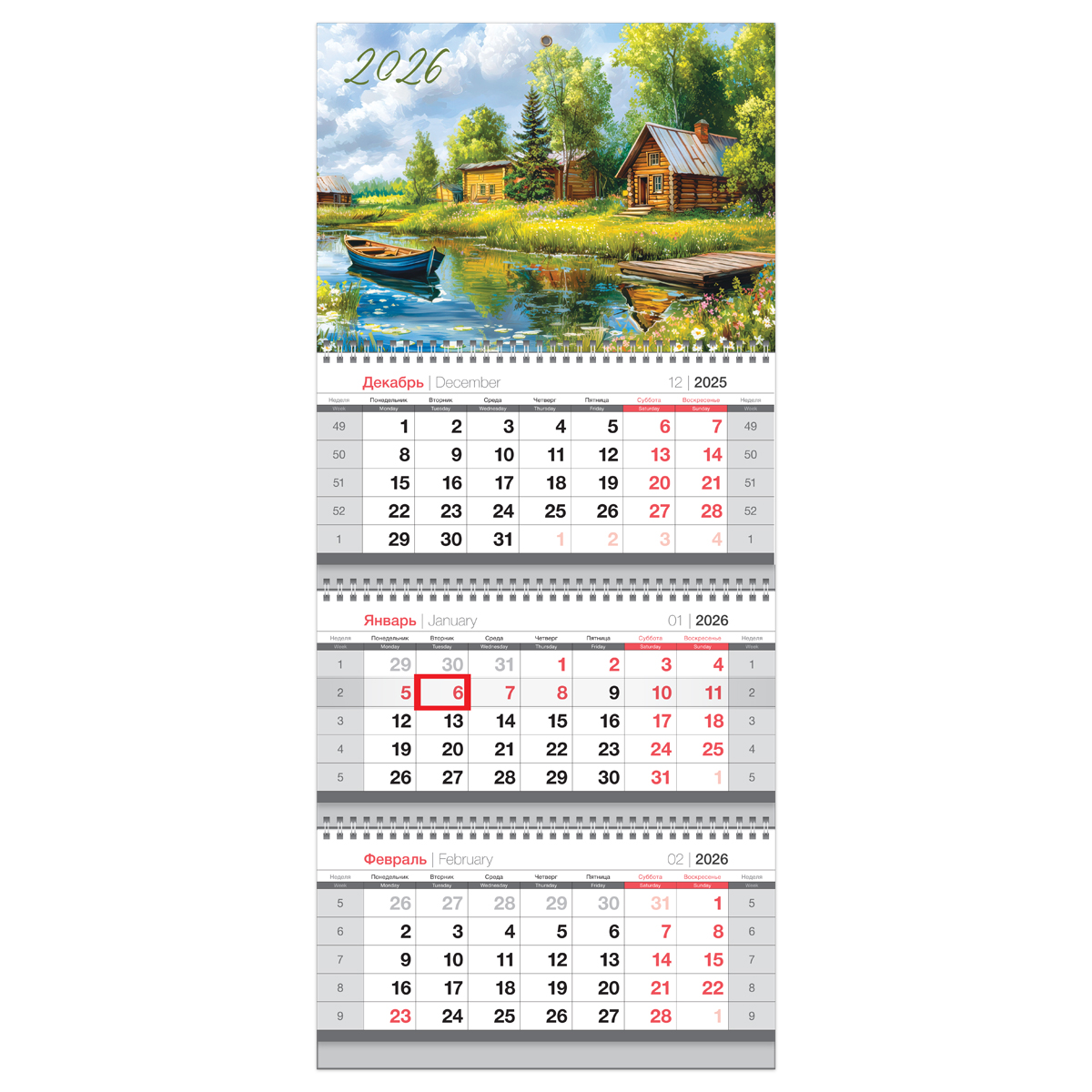 Квартальный календарь bg Mini «Деревня» на 2026 год — отличный инструмент для планирования в офисе и дома. Размер календаря — 195*445 мм. Ориентация — вертикальная. Календарь состоит из трёх блоков по 12 листов, закреплённых на трёх гребнях. Изготовлен из белой офсетной бумаги плотностью 90 г/м² с двухцветной печатью. Подложки изготовлены из чистоцеллюлозного мелованного картона 290 г/м2. Нижняя имеет цветность в одну краску, верхняя — полноцветная. Бегунок-курсор помогает легко ориентироваться по датам, а пикколо позволяет удобно разместить календарь на стене.