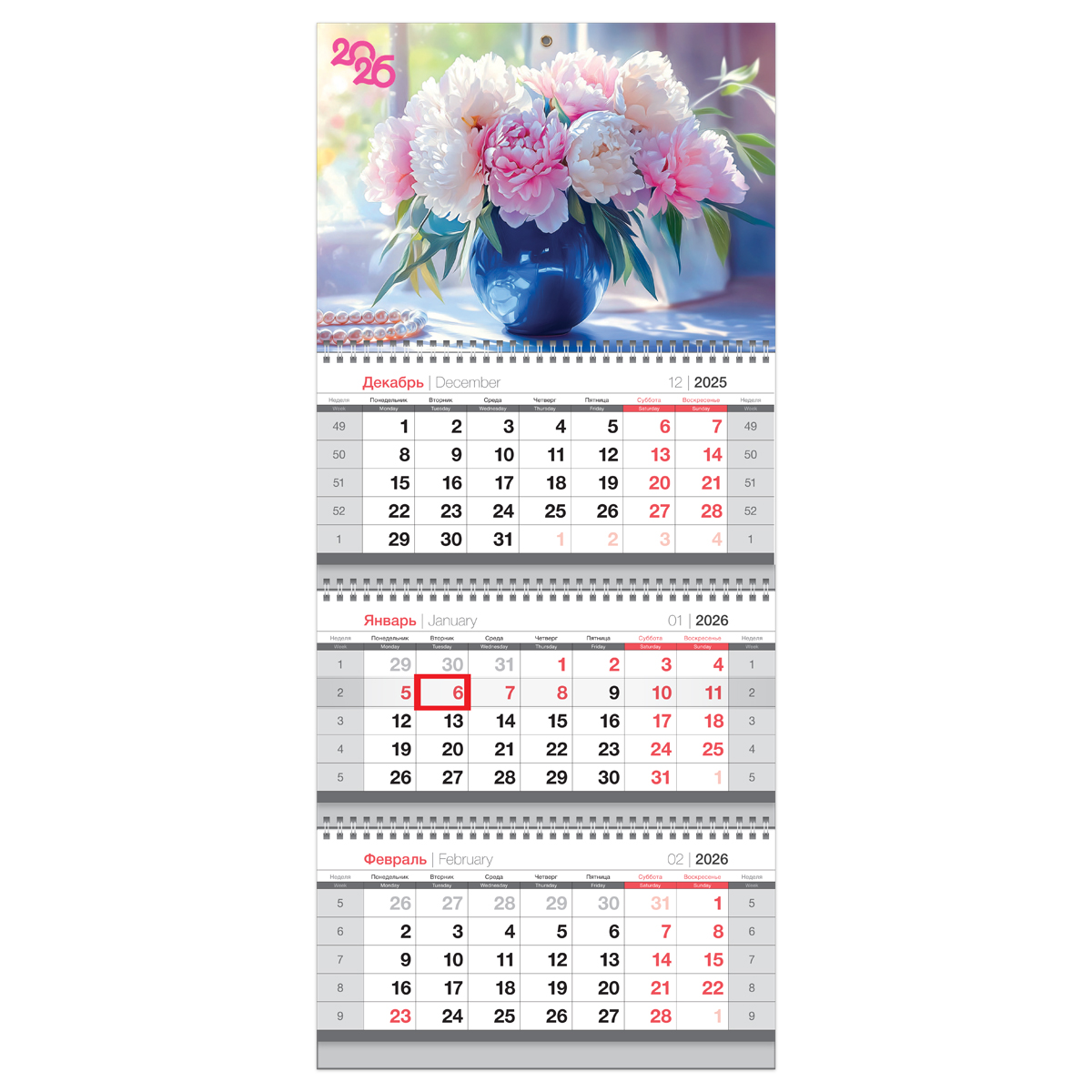 Квартальный календарь bg Mini «Букет пионов» на 2026 год — отличный инструмент для планирования в офисе и дома. Размер календаря — 195*445 мм. Ориентация — вертикальная. Календарь состоит из трёх блоков по 12 листов, закреплённых на трёх гребнях. Изготовлен из белой офсетной бумаги плотностью 90 г/м² с двухцветной печатью. Подложки изготовлены из чистоцеллюлозного мелованного картона 290 г/м2. Нижняя имеет цветность в одну краску, верхняя — полноцветная.