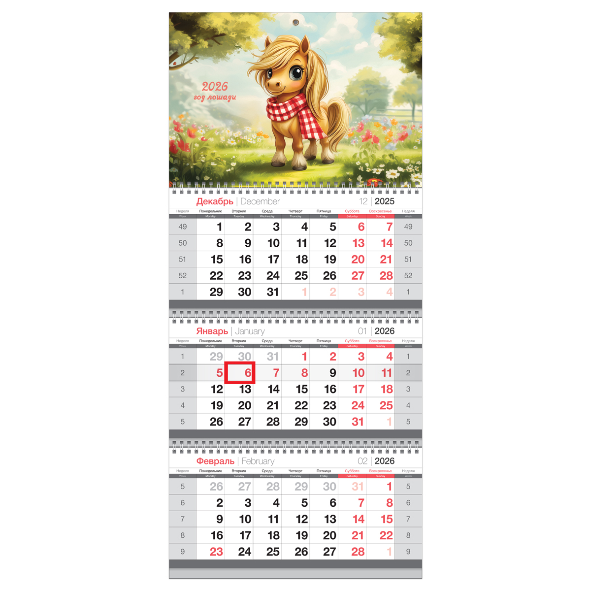 Календарь квартальный BG «Лошадь» на 2026 год – незаменимая вещь в жизни делового человека и отличный помощник для офиса. Размер вертикального календаря – 295×660 мм. 3 календарных блока по 12 листов на 3 гребнях изготовлены из офсетной белой бумаги плотностью 65 г/м2 с печатью в 2 краски. Подложка изготовлена из чистоцеллюлозного мелованного картона 200 г/м2. Нижняя имеет цветность в 1 краску, верхняя – полноцветная. Есть удобный бегунок-курсор и пикколо для подвески.