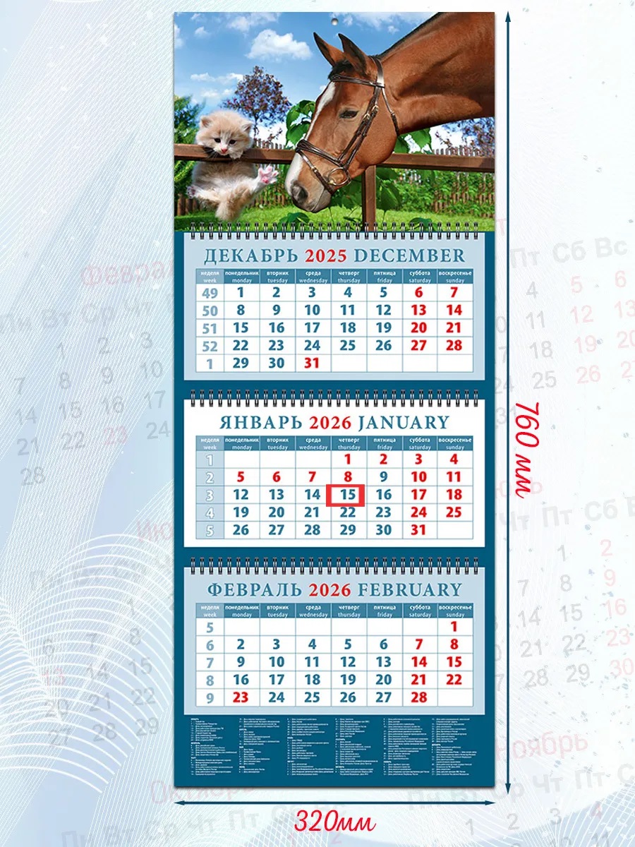 Календарь кварт 2026г ДД 14607 3бл 3гр 320*760мм Год Лошади Давай дружить