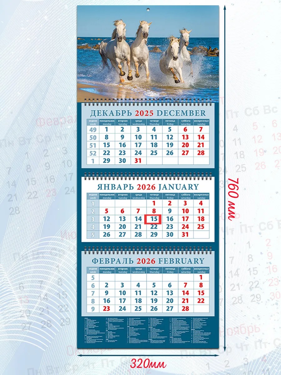 Календарь квартальный 2026 год "Год лошади. Стремительная четверка на морском берегу" на трех спиралях и пикколо, 320х760 мм. Подложка – картон 275 г/м2, блоки – офсетная бумага плотностью 70 г/м2 с перфорацией для отрыва