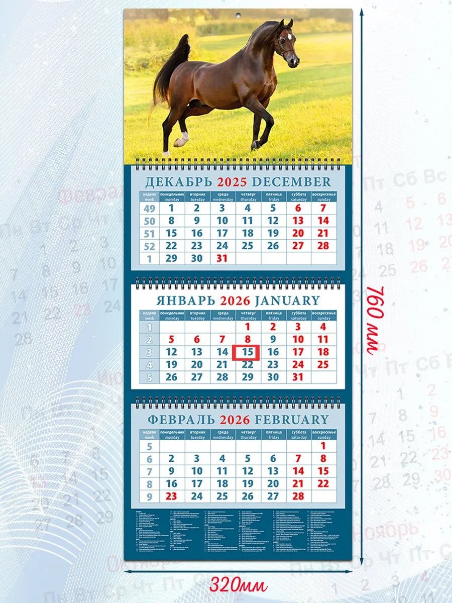 Календарь кварт 2026г ДД 14621 3бл 3гр 320*760мм Год Лошади на лугу
