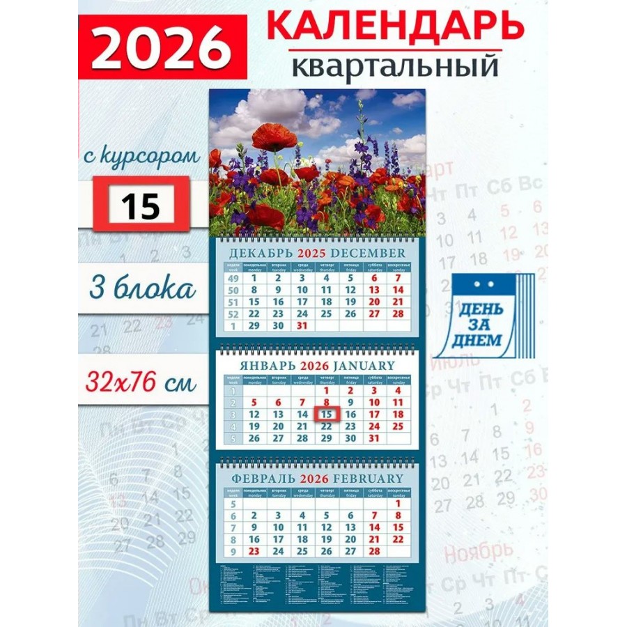 Календарь квартальный 2026 год "Красные маки" на трех спиралях и пикколо, 320х760 мм. Подложка – картон 275 г/м2, блоки – офсетная бумага плотностью 70 г/м2 с перфорацией для отрыва