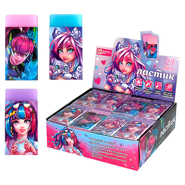 Ластик , арт.63626/ 24 РОМАНТИЧНЫЕ ДЕВУШКИ (шоу-бокс, 24 шт., ассорти, голубой, розовый, фиолетовый, 25x50x10 мм, ПВХ, форма: прямоугольная, ПЭТ-плёнка + картонная обертка).