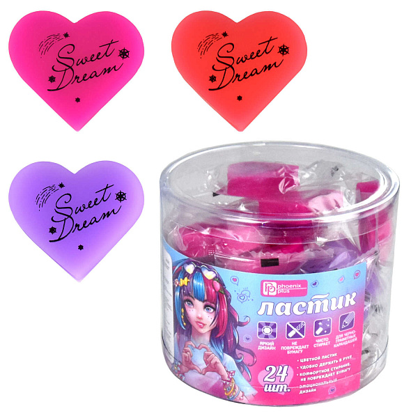Ластик , арт.63627/ 24 СЕРДЕЧКИ (ПВХ-бокс, 24 шт., ассорти, коралловый, фиолетовый, фуксия, 40х37х10 мм, ПВХ, печать в 1 краску, форма: вырубная, ПЭТ-пакет).