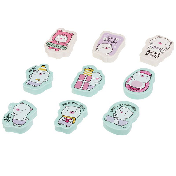 Ластик MESHU Сute – яркий и забавный помощник в школе, офисе и дома. Ластики фигурной формы выполнены из высококачественной термопластичной резины. Представлено ассорти из 9 веселых дизайнов ластика белого и мятного цветов с рисунком милых медвежат. Размер – 40*30*13 мм. Отлично стирает чернографитный карандаш.