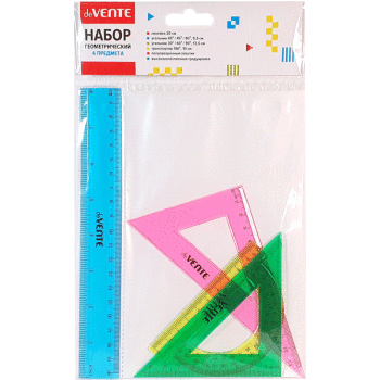Набор геометрический "deVENTE" малый, 4 предмета (линейка 20 см, 2 угольника, транспортир) полупрозрачный цветной, в пластиковом блистере