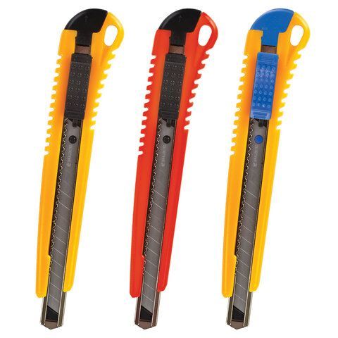 Корпус ножа создан из качественного пластика, а выдвижные лезвия шириной 9 мм изготовлены из высокопрочной стали. Они надежно закреплены на корпусе с помощью специальной защелки, которая позволяет регулировать длину ножа. Когда лезвие перестанет быть острым, можно с легкостью обломать непригодную часть по наклонной метке на поверхности лезвия