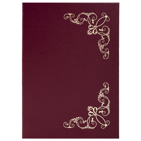 Изготовлена из прочного картона, покрытого бумвинилом. Папка формата А4 универсального назначения выполнена в насыщенном бордовом цвете. На обложке - орнамент и надписи, сделанные золотым тиснением. Снабжена лентой для удержания документов (ляссе). Предусмотрено нанесение логотипа.