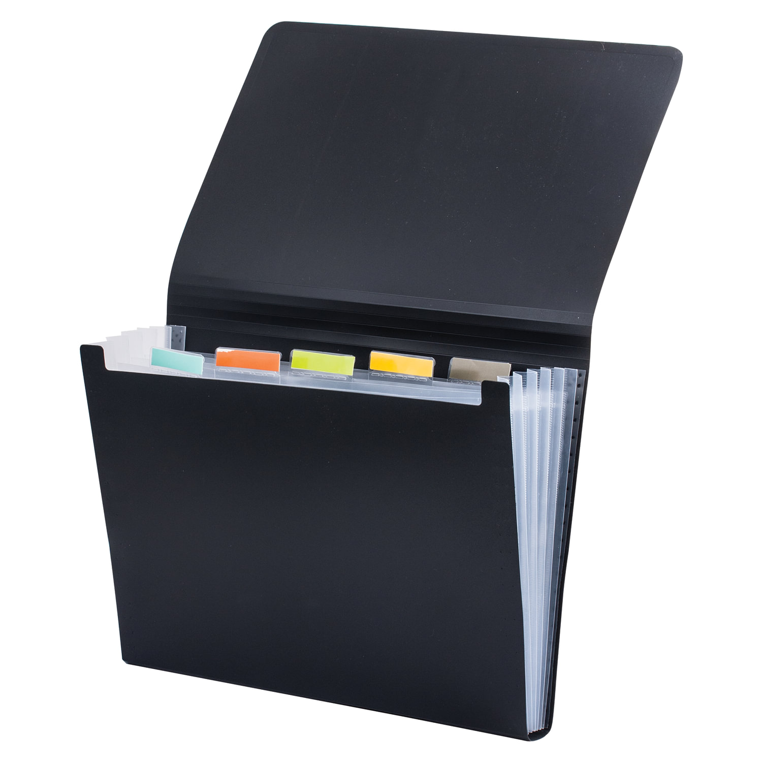 Папка формата А4 изготовлена из качественного пластика толщиной 0,5 мм с матовой фактурой и содержит 6 отделений, которые позволяют структурировать документы. Для удобства поиска нужного документа папка снабжена индексными ярлыками. Резинки, расположенные по углам, плотной закрывают папку, не позволяя содержимому выпасть и надежно защищая от влаги, пыли и прочих механических повреждений. Папка представлена в солидном черном цвете.