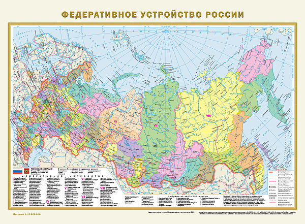 Двухсторонняя покрытая полимерной плёнкой карта имеет размеры 575х420 мм. На одной её стороне - обновлённая Политическая карта мира в масштабе 1:58 000 000 (в 1 см 580 км), на другой – обновлённая карта "Федеративное устройство России" в масштабе 1:15 000 000 (в 1 см 150 км). На Политической карте мира цветом и подписями показаны все независимые государства с их столицами, а также владения и территории с особым статусом. Населённые пункты на карте даны в трёх градациях численности: более 1 млн жителей, от 100 тыс. до 1 млн, менее 100 тыс. жителей. На карте России представлены все 89 субъектов Федерации (с Донецкой и Луганской народными республиками, Запорожской и Херсонской областями, Республикой Крым и Севастополем), с их столицами и центрами. Субъекты РФ сгруппированы по 8 федеральным округам. Показаны магистральные пути железнодорожного и автомобильного сообщения. Рекомендовано для широкого круга пользователей.