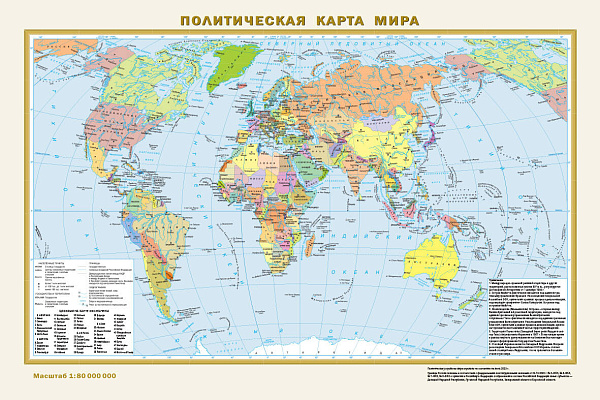 Эта настенная карта, покрытая с обеих сторон полимерной плёнкой, имеет размеры 440х290 мм. Она состоит из двух карт одинакового масштаба 1:80 000 000 (в 1 см 800 км). Физическая карта мира наглядно отражает распределение горного, равнинного и производных типов рельефа по поверхности суши Земли. Пунсонами с высотными отметками показаны высочайшие вершины всех континентов и основных горных систем. Объекты гидрологической сети на карте включают все наиболее крупные реки с притоками и озёра. Представлен также рельеф дна Мирового океана с выделением хребтов, котловин и глубоководных желобов с их наибольшими глубинами. В океанах показаны тёплые и холодные течения. На Политической карте показаны все независимые государства мира с их столицами, а также зависимые территории и территории с особым статусом. Россия представлена в новых границах: с Донецкой и Луганской Народными республиками, Запорожской и Херсонской областями, Республикой Крым и Севастополем. Населённые пункты на карте даны в трёх градациях численности: более 1 млн жителей, от 100 тыс. до 1 млн, менее 100 тыс. жителей. Рекомендовано для широкого круга пользователей.