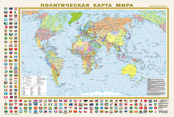 Карта масштаба 1:44 000 000 (в 1 см 440 км) отражает современное политическое устройство мира. На карте контрастными цветами показаны все независимые государства мира с их столицами (включая Российскую Федерацию в новых границах), а также зависимые территории и территории с особым статусом. Населённые пункты на карте даны подписями и пунсонами в трёх градациях численности: менее 100 тыс. жителей, от 100 тыс. до 1 млн, более 1 млн жителей. Карта обрамлена официальными флагами всех 199 независимых государств мира, расположенными в алфавитном порядке, что облегчает их поиск. Политическая карта мира имеет размеры 87х58 см и покрыта с лицевой стороны антибликовым покрытием. Рекомендовано для широкого круга пользователей. Карта упакована в прозрачный тубус (пакет с объёмным дном и еврослотом) из мягкого пластика. Размеры тубуса: длина 80 см, диаметр 5 см.