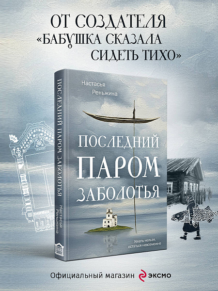«Последний паром Заболотья» — новая книга Настасьи Реньжиной, автора бестселлера «Бабушка сказала сидеть тихо». Это пронзительный роман о русском Севере и вымирающих деревнях Вологодчины, о силе места, семейных травмах и мучительном выборе между родной землей и будущим.