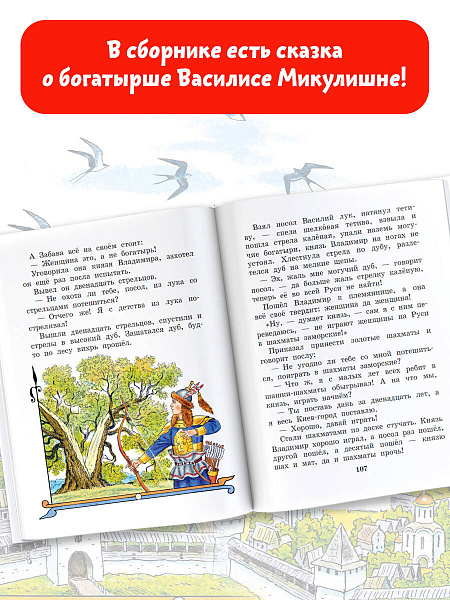 В книгу вошли знаменитые былины о великих русских богатырях в пересказе известной фольклористки И.В. Карнауховой. Илья Муромец, Алёша Попович, Добрыня Никитич, Святогор-богатырь, Вольга Всеславьевич — об этих богатырях знает и стар и млад. Они очень сильны, за богатством не гонятся, на пирах животы не растят, а защищают русскую землю для чести и славы богатырской. Есть в этой книге и знаменитая былина о Василисе Микулишне — богатырше, которая хитростью вызволила своего мужа из заточения. Иллюстрации