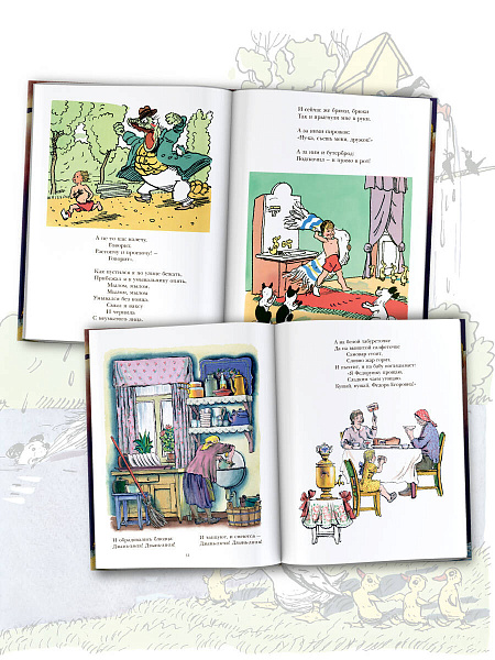 доктора Айболита, про Муху-Цокотуху и её храброго спасителя Комарика, про страшного Крокодила, проглотившего солнце в небе, про Федорино горе, весёлые, добрые стихи про бедного Федотку, про страшную Закаляку, английские песенки про курицу-красавицу, про хитрого Котауси и умную Мауси,про обжору Барабека…