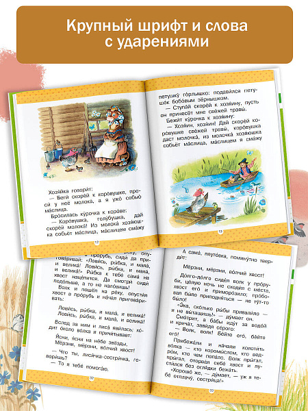 Этот сборник сказок предназначен для самостоятельного чтения. Это очень важный этап развития речи ребёнка. От того, насколько комфортно произойдёт переход от слушателя к читателю, будет зависеть быстрота чтения, понимание прочитанного и любовь к книгам. Начинать читать самостоятельно лучше по знакомым произведениям, которые дети уже слышали в раннем детстве. Маленькие читатели встретятся с героями русских народных сказок – с петушком, который подавился зёрнышком, а спасли его курочка, хозяин с хозяюшкой и кузнец. Никто не остался в стороне! А ещё с козой-дерезой, обманщицей и плутовкой, которая выгнала зайчика из его избушки... Но закончилось всё хорошо – зайка снова в своей избушке живёт, морковку грызёт, вам кланяется. В книге крупный шрифт и слова с ударениями.